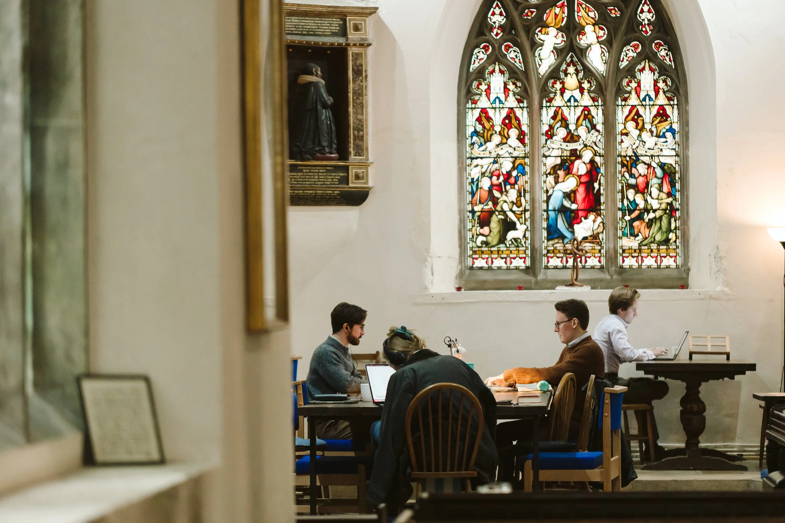 The scriptorium is open to postgraduate students in Cambridge for research and prayer within a Christian community. The hope is to nurture students across a variety of subjects in the university to foster a sense of purpose and faith in their research and scholarly callings. The scriptorium offers a place for scholars to network and make life-long connections within the academy and the church.